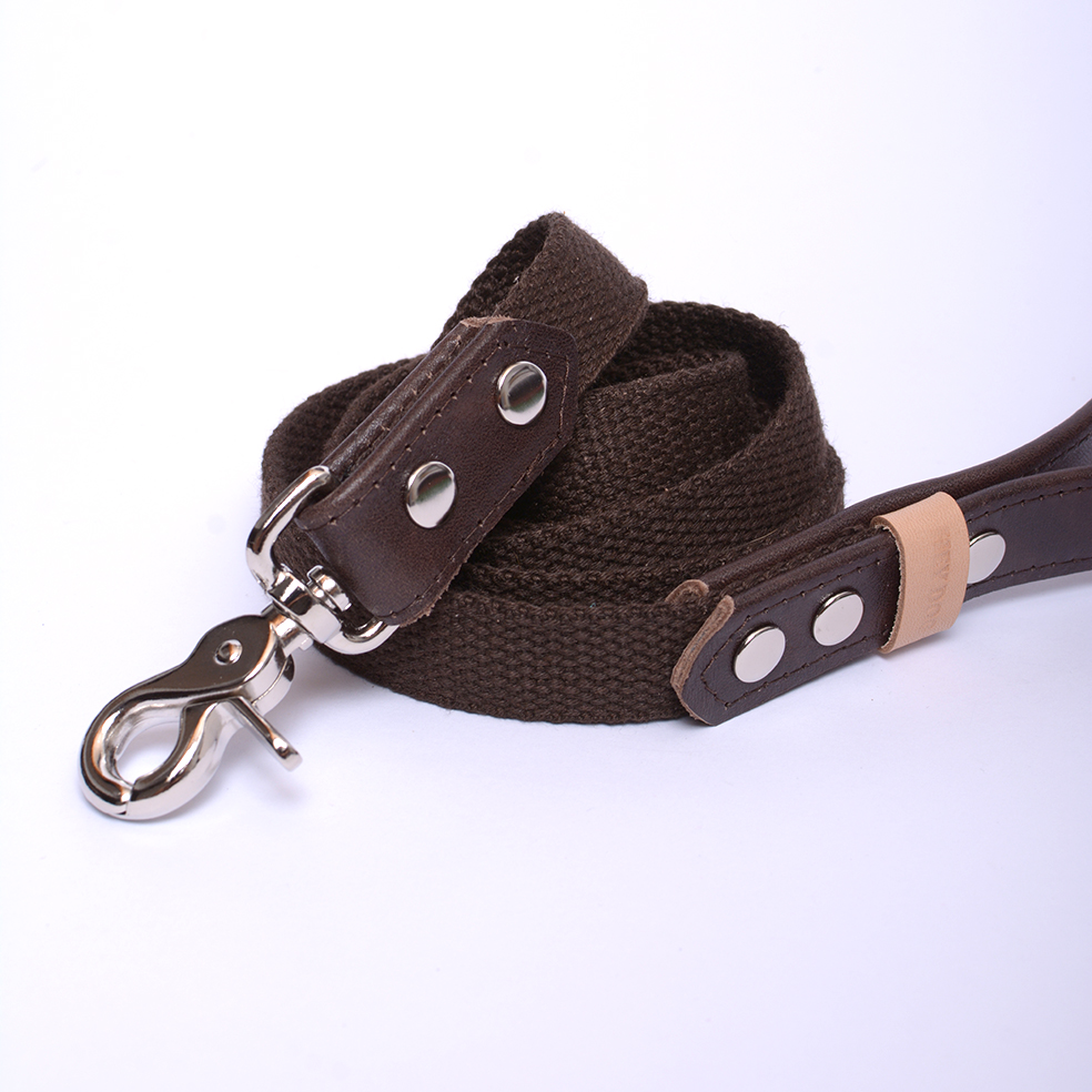 Our leashes are light and comfortable to use. Leather color: classy brown. Tape color: brown. Hardware is made of solid brass, polished to a high gloss. We suggest setting up this leash with a HEY DOG Bitter Choco collar, making your dog stylish and exceptional.
