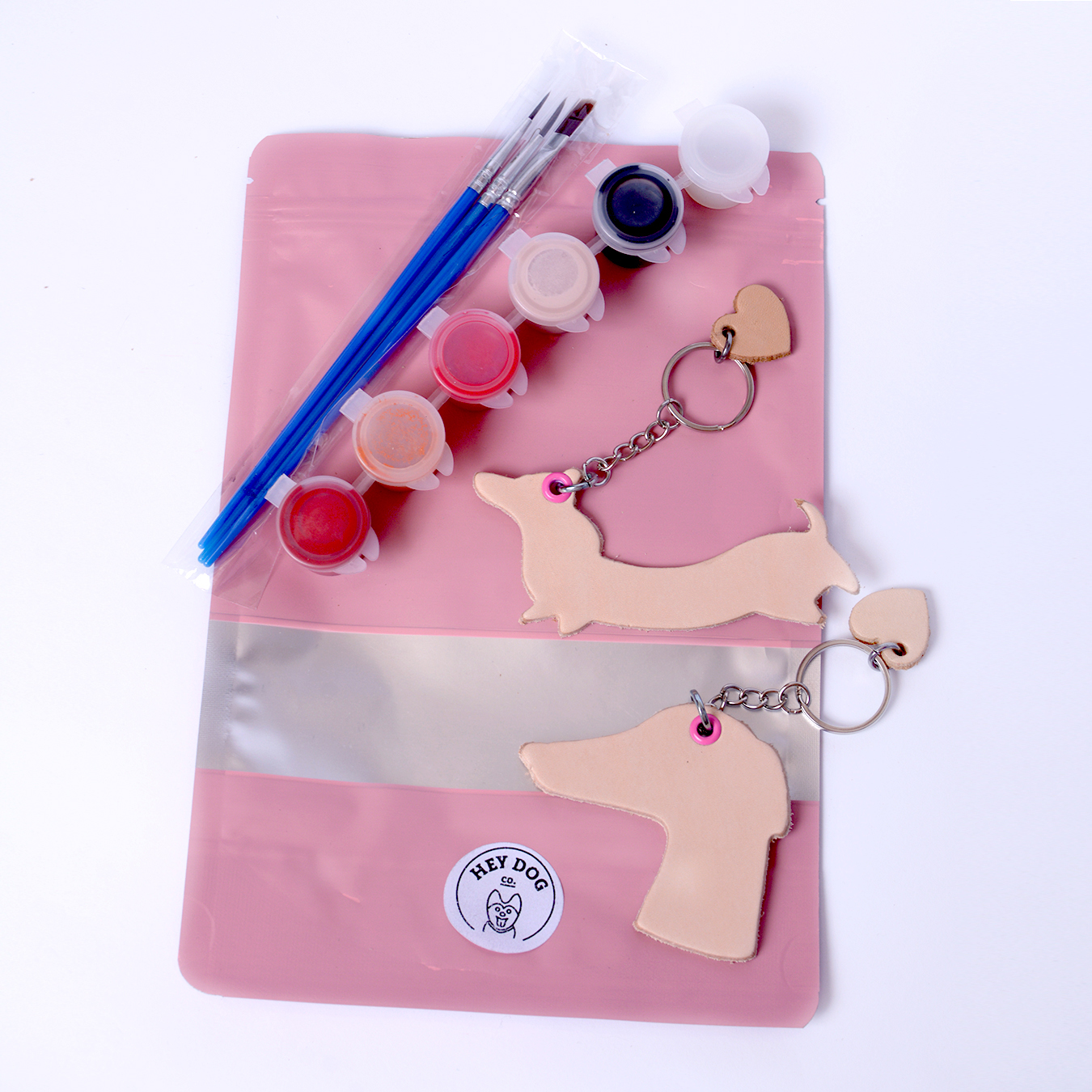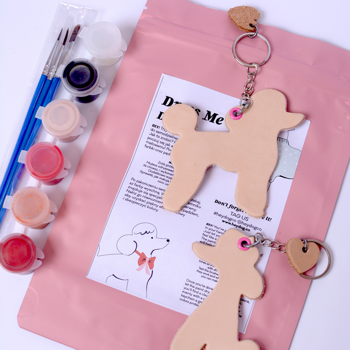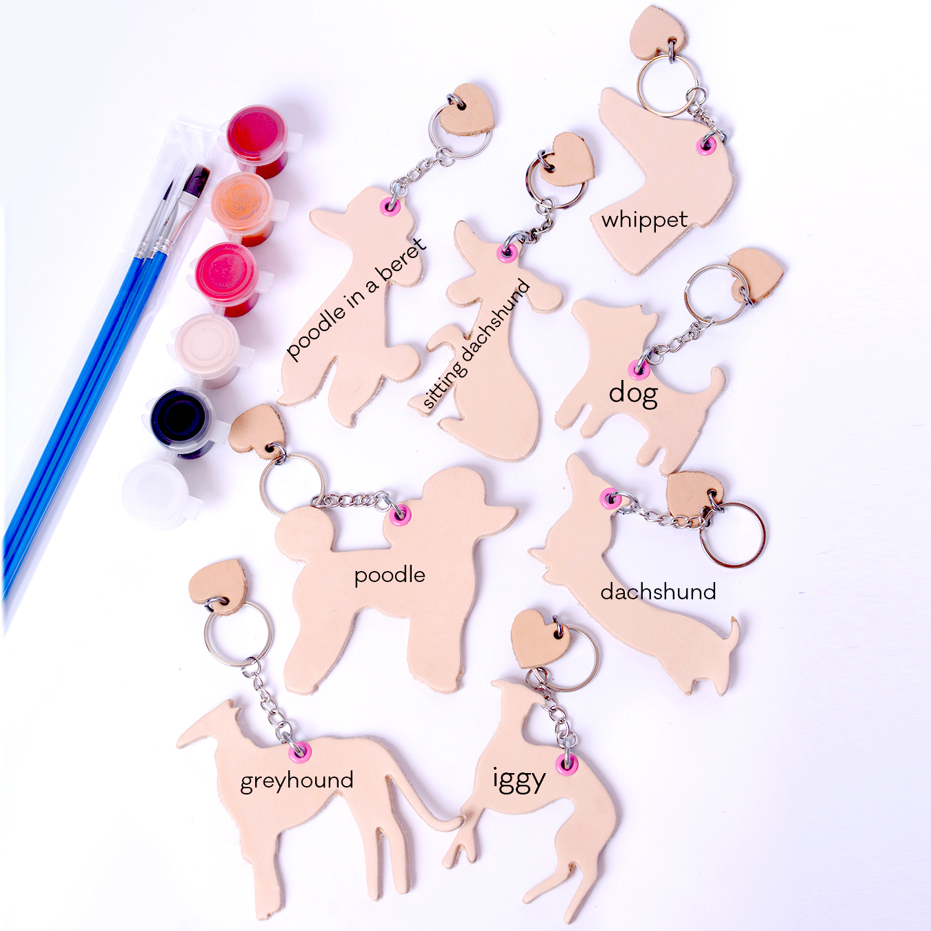 Two leather keychains in a light beige color. Choose any two shapes in the product options. A set of three brushes – each has a different size and paints different lines. We recommend testing them on a piece of paper first to see how they work. A set of five paints. Choose from three color versions: BOY, GIRL, and LOVE.