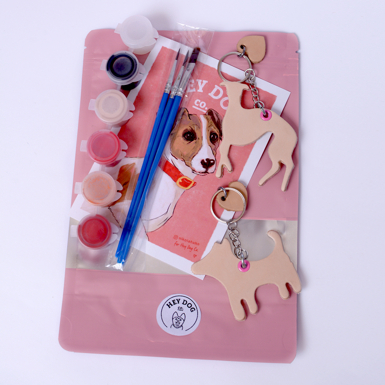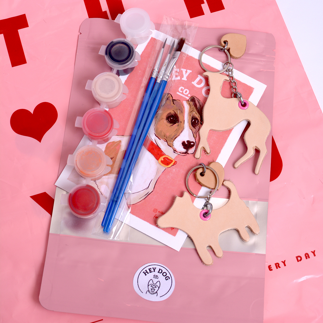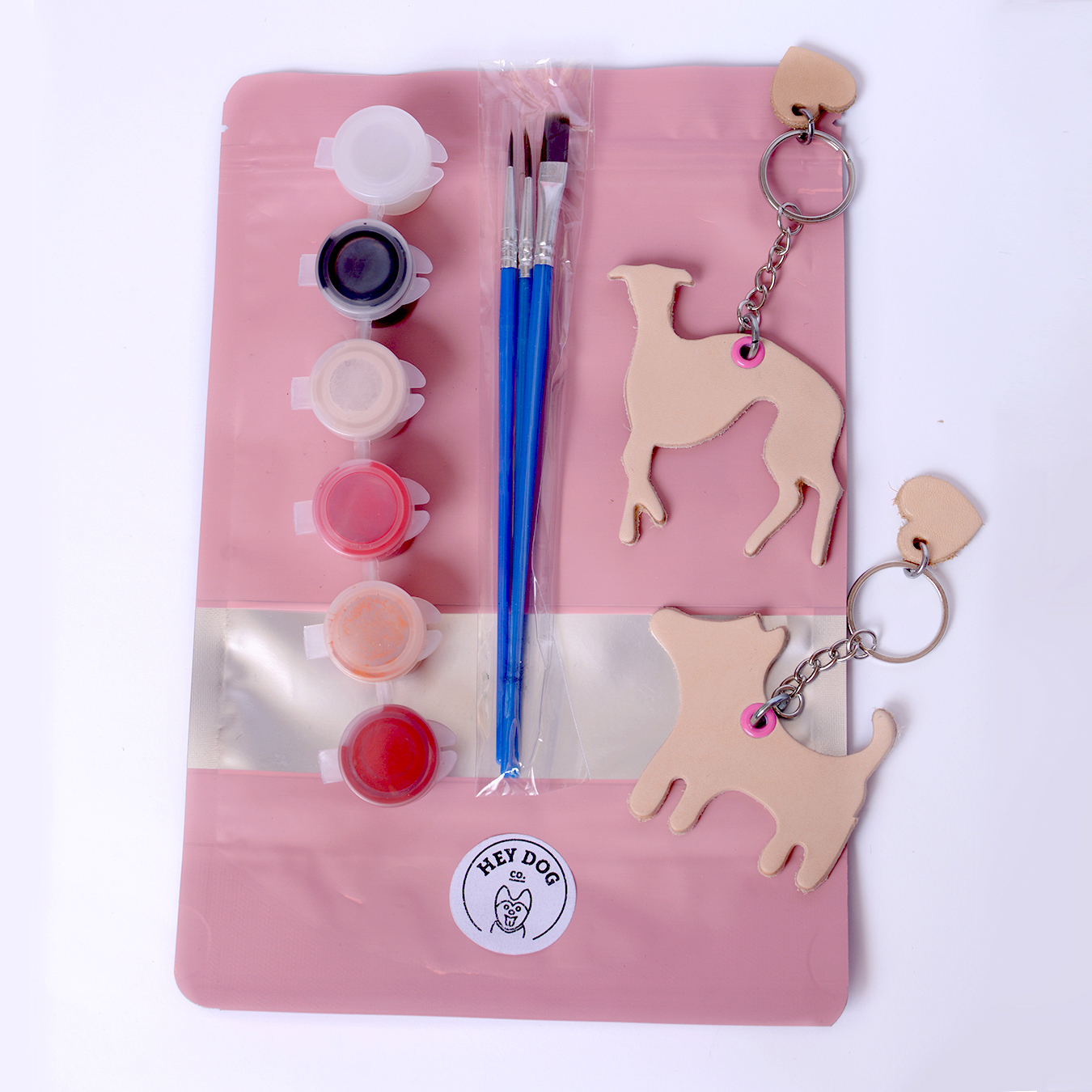 Two leather keychains in a light beige color. Choose any two shapes in the product options. A set of three brushes – each has a different size and paints different lines. We recommend testing them on a piece of paper first to see how they work. A set of five paints. Choose from three color versions: BOY, GIRL, and LOVE.