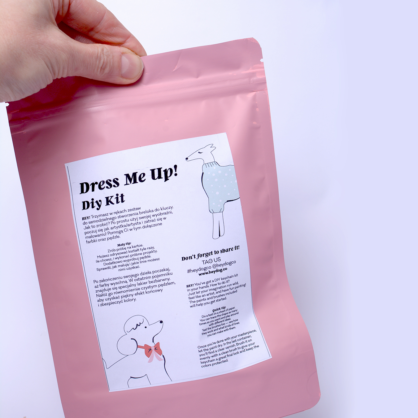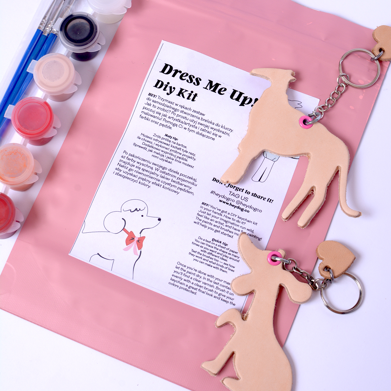The sixth container contains clear varnish for finishing the keychain. Apply it once the paints are dry. Simply apply it with a clean brush to the entire keychain. This will give it a nice shine and protect the colors. Everything is packed in a pink bag with a love card attached with a secret discount code for your next purchase.