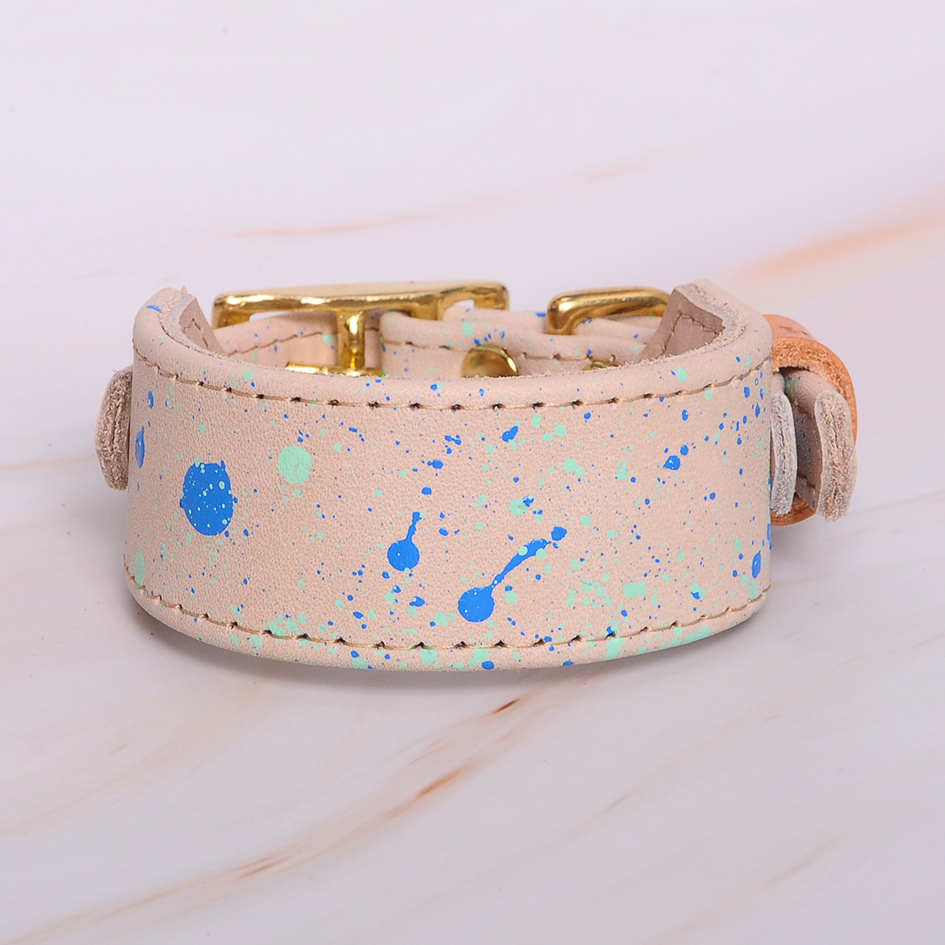 The collar is hand made of soft and strong, grain cowhide leather. Hand-painted. Colors: beige with blue and mint dots. High quality solid brass (gold) or nickel plated steel (silver) hardware. Polished to a high gloss. Next to the size, choose the color of the fittings.